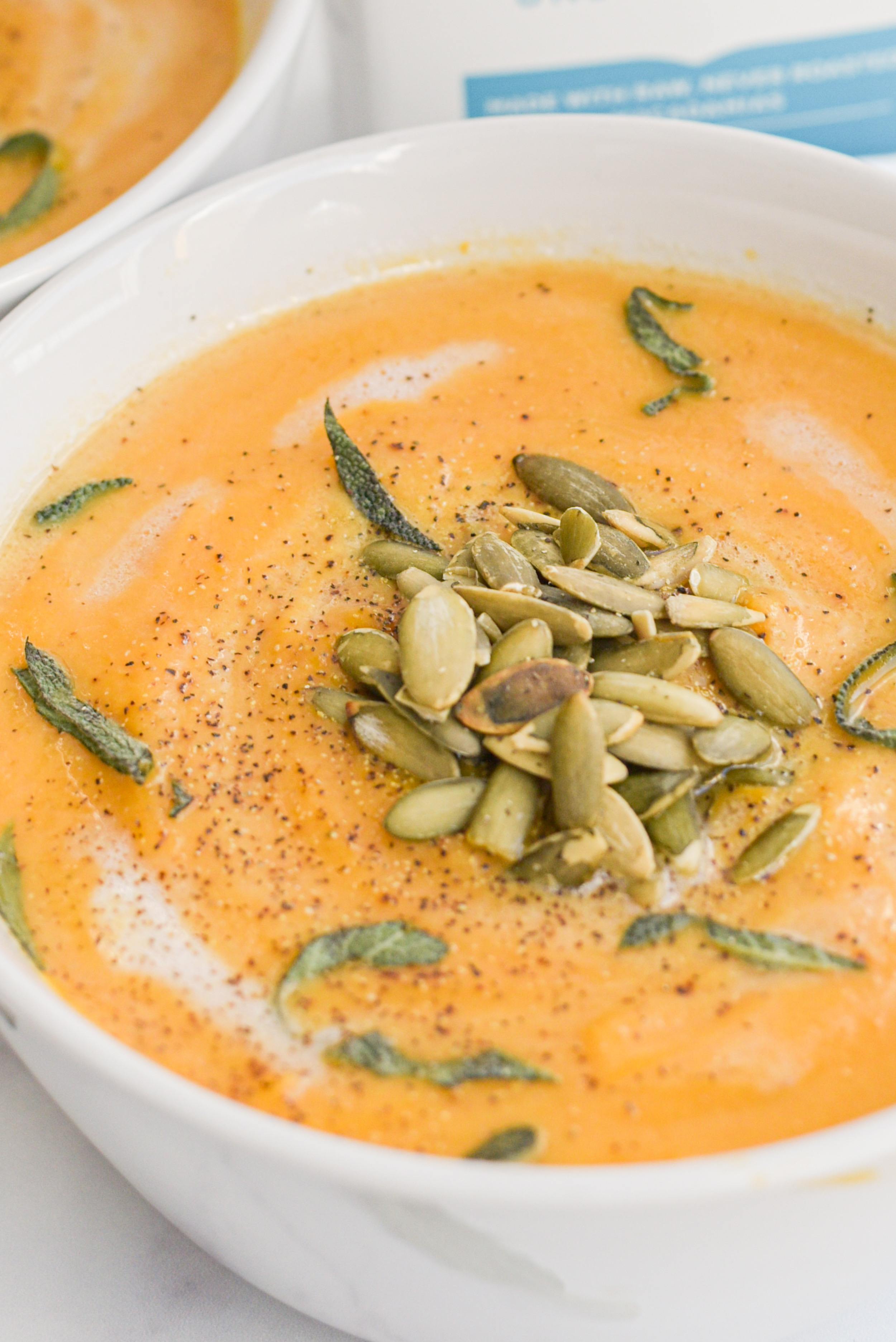 6. Serve and garnish with pumpkin seeds, fresh sage and coconut cream.