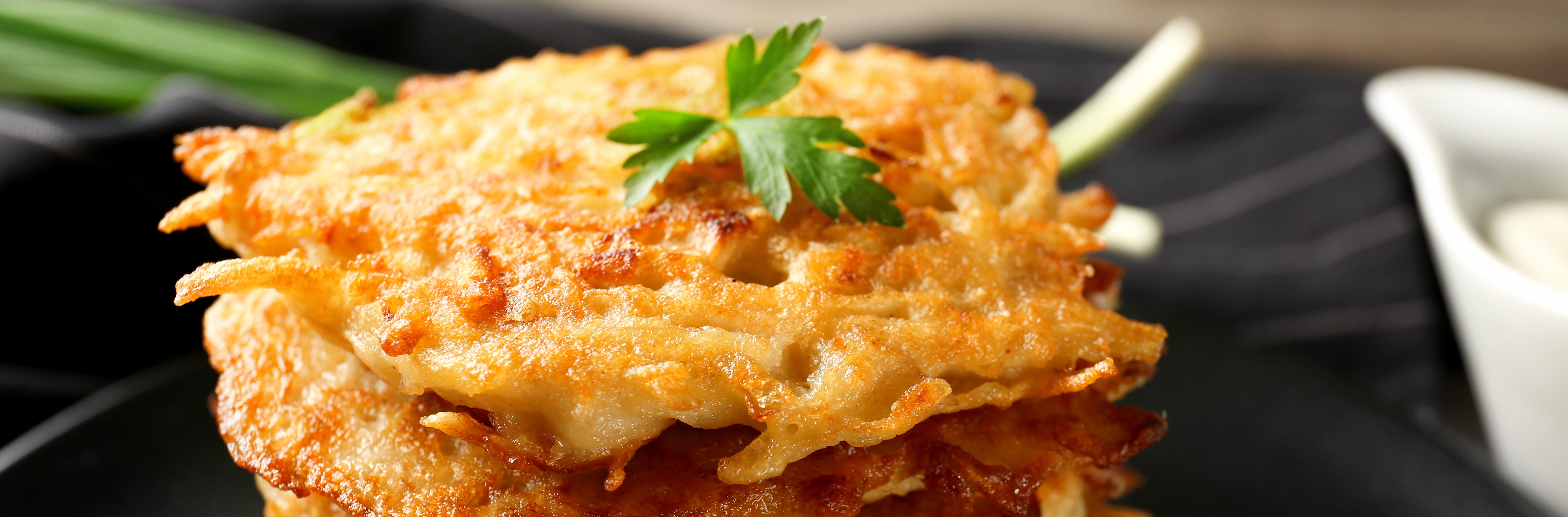- Heat oil in pan and spoon about 1/3 c. mixture into the pan for each latke.
