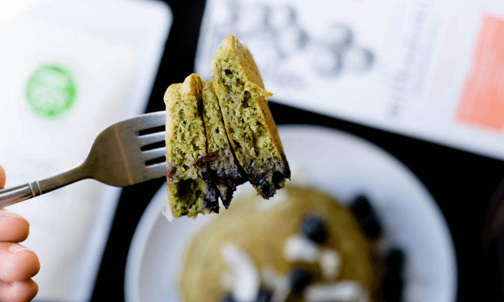 - Heat a nonstick pan on medium-low heat, and add ⅓ of the batter. While the pancake is beginning to cook, dot the bottom of the pancake with blueberries.
