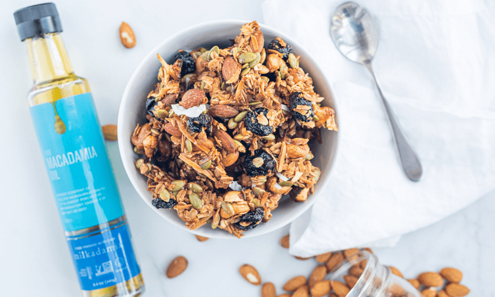 - Pour the granola mixture onto the baking sheet. Spread evenly but keep the granola touching so that you can break it apart later.
