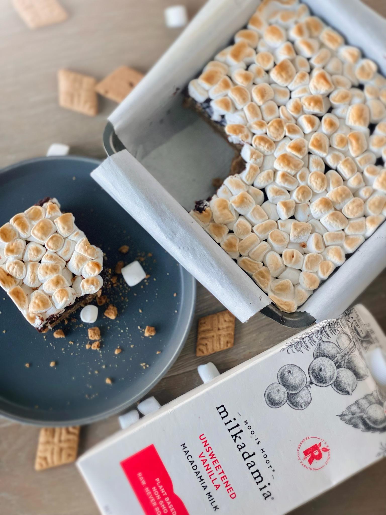 - Lastly, cover the middle layer in vegan marshmallows. Turn your oven to a low broil and place the 8×8 pan back in the oven on the middle rack. Keep an eye on the marshmallows because they can burn very quickly. They will only need about 2 minutes. Cut and enjoy!