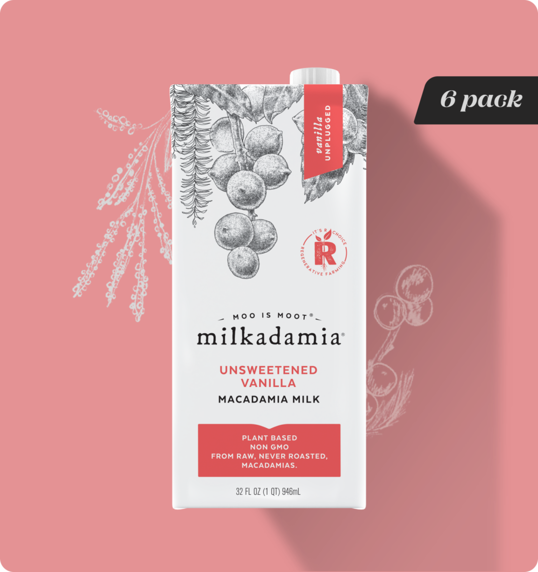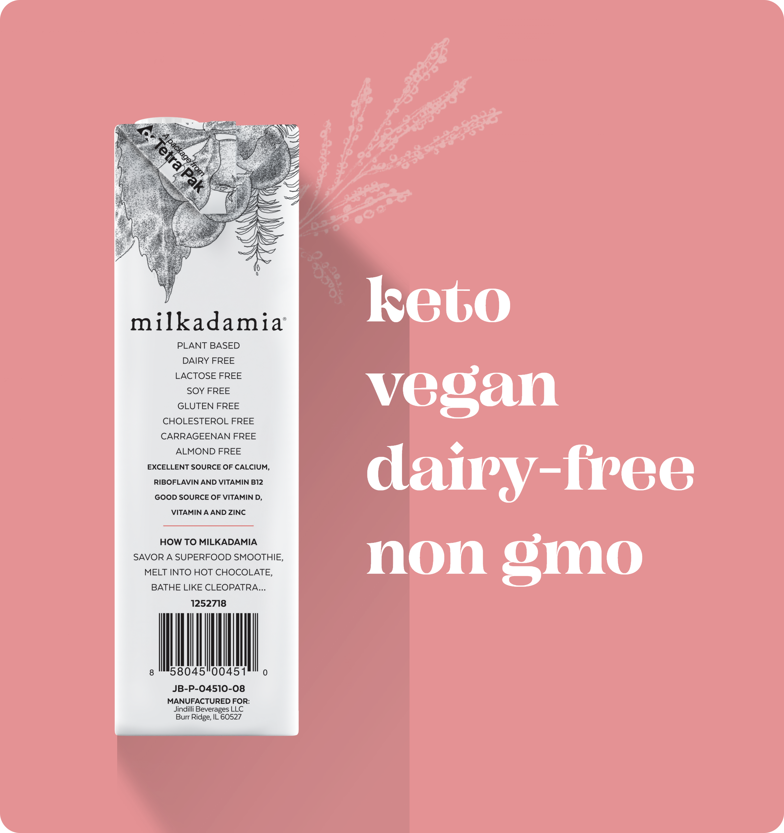 Macadamia Milk (Filtered Water, Macadamias), Calcium Phosphate, Natural Flavors, Pea Protein, Guar Gum, Sunflower Lecithin, Sea Salt, Gellan Gum, Zinc Sulfate, Vitamin A Acetate, Vitamin D2, Riboflavin (B2), Vitamin B12.