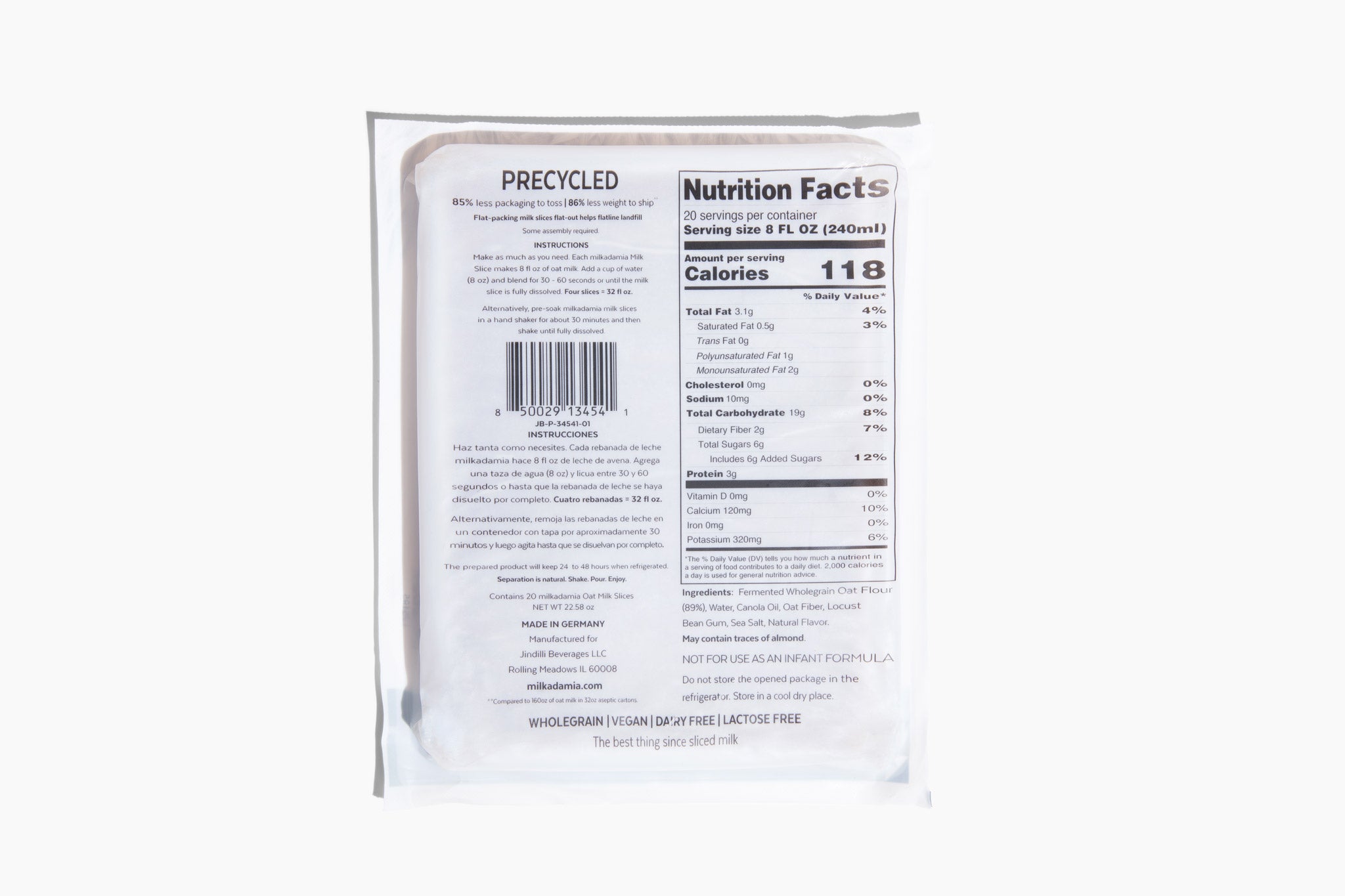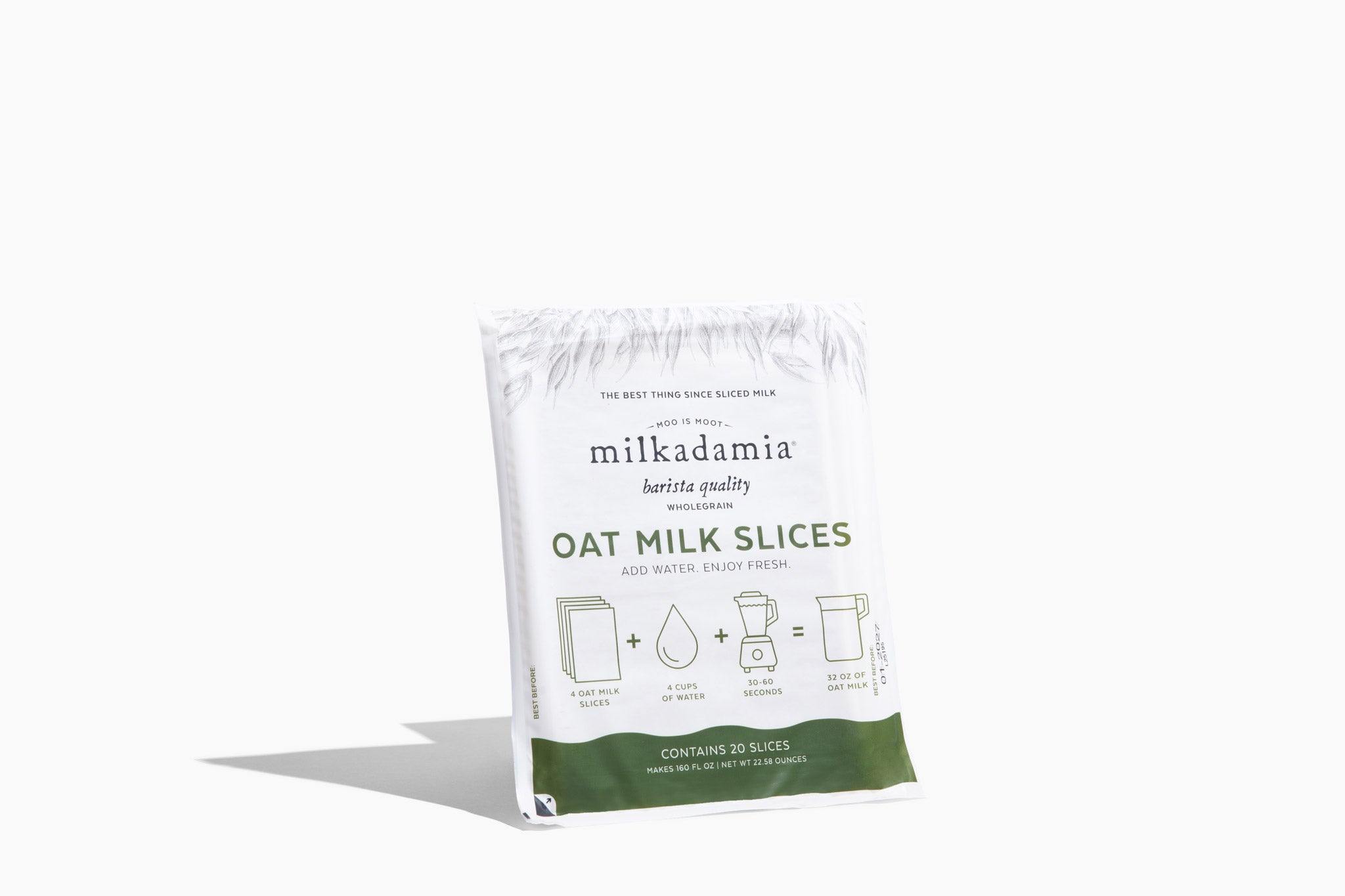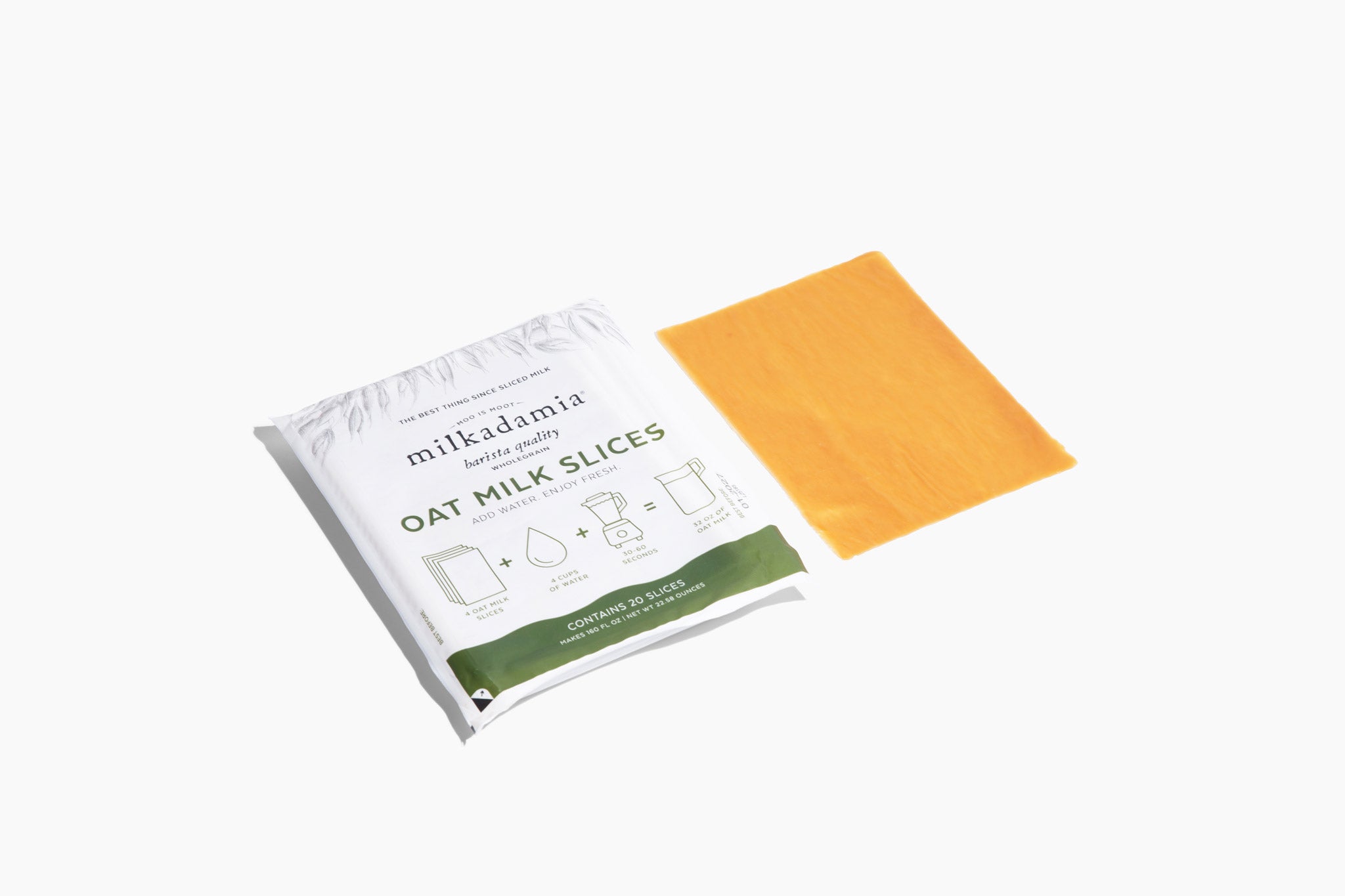 Oat Milk Slices are finally here! This revolutionary product is easily proportionable for always fresh plant-based milk - just blend with water! This precycled product utilizes 85% less packaging, and has a shipping weight 86% less than traditional plant milk. Flat-packing milk slices flat-out helps flatline landfill.