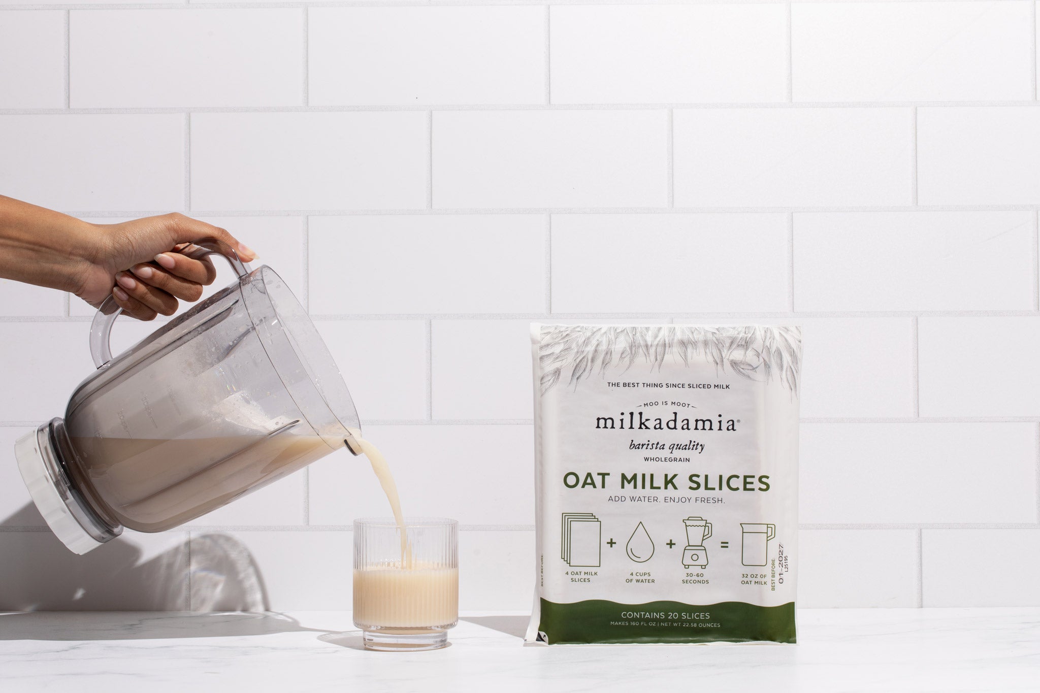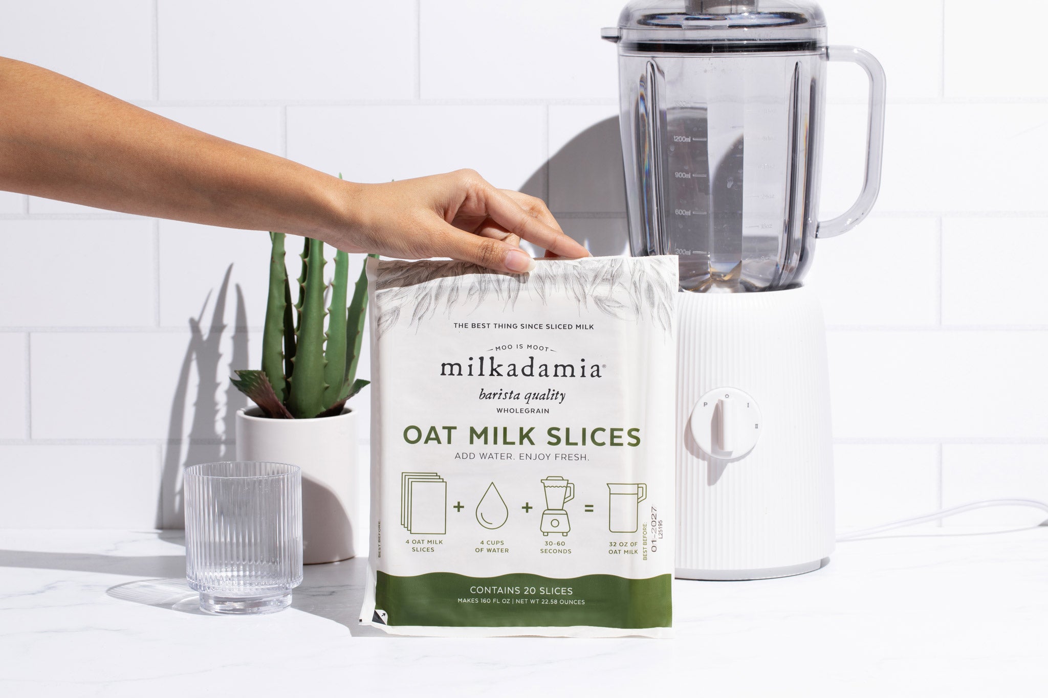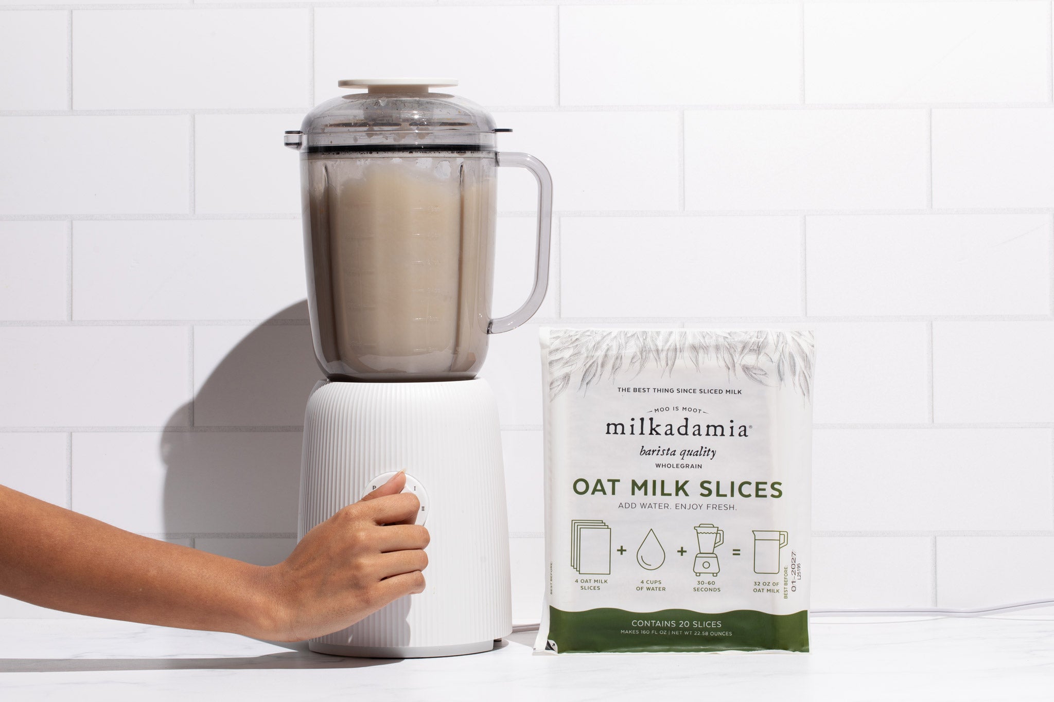 Oat Milk Slices are finally here! This revolutionary product is easily proportionable for always fresh plant-based milk - just blend with water! This precycled product utilizes 85% less packaging, and has a shipping weight 86% less than traditional plant milk. Flat-packing milk slices flat-out helps flatline landfill.